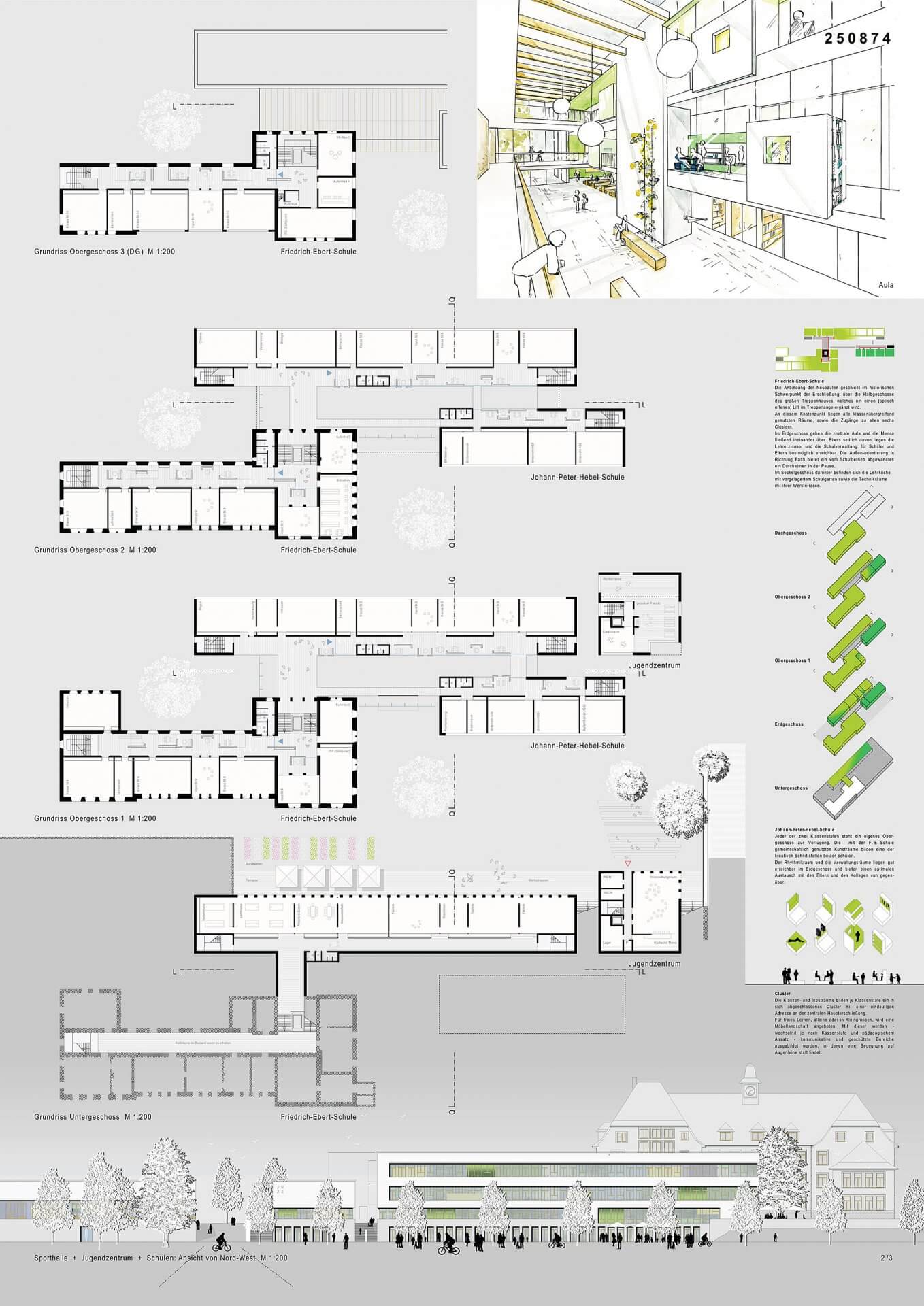 Die Gebäude und Funktionseinheiten entwickeln sich entlang einer Achse, welche zugleich die Außenräume und Eingangssituationen auffädelt und diese im Inneren der Schulen zum gemeinsamen Kommunikations- und Erlebnisraum überführt. Diese Achse erhält im Bereich des neuen, öffentlichen Platzes, zu dem sich der Vereinssport und das Jugendzentrum orientieren, einen Versatz. Hier kreuzt die Verbindungsachse zum Grünraum und zum Quartier an der Feldbergstraße: es entsteht ein Platz zum Begegnen, Verweilen und Aufenthalt nach dem gemeinsamen Sport. Hier liegt auch der Eingang zum Jugendzentrum.