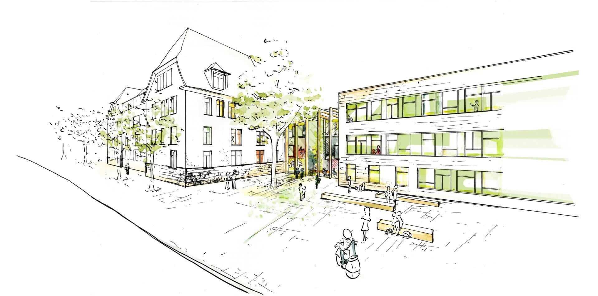 Der Altbau behält seine historische, prägende Stellung und zeigt sich im Straßenraum allseitig freistehend. Lediglich zwei Brücken verbinden Alt- und Neubauten und stellen somit die historische Fassade auch im Innenraum der Aula frei.