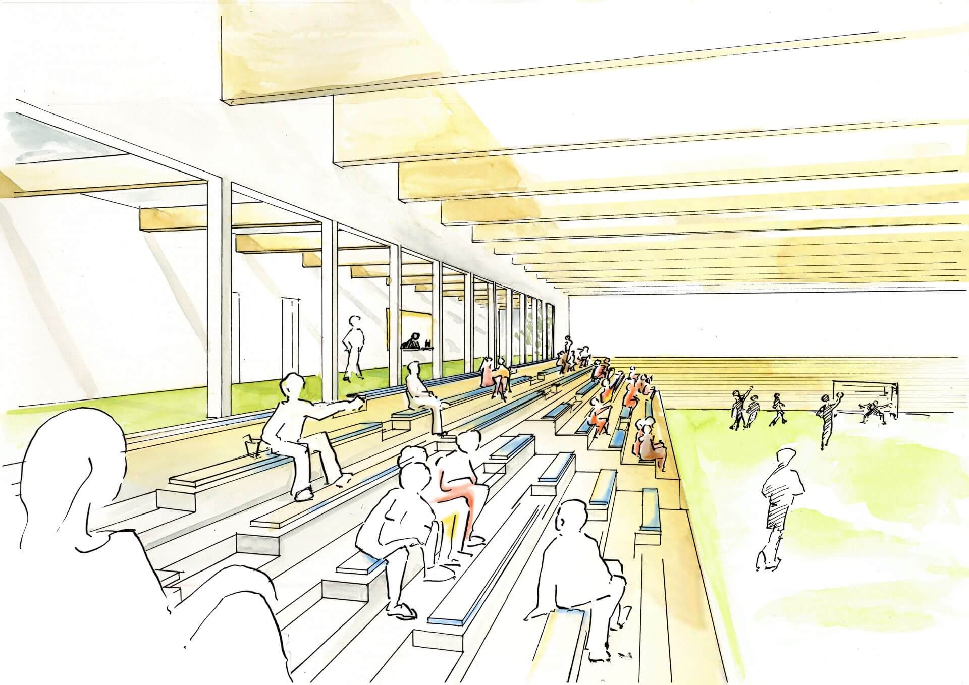 Für den Schul- oder Vereinssport können die Umkleiden ohne Öffnen des Foyers erreicht werden, bzw. zu großen Sportveranstaltungen können Spieler und Zuschauer – wie in der bisherigen Halle auch – das Gebäude unabhängig voneinander betreten. Wo immer möglich werden neben dem Foyer auch das Spielfeld und der Stiefelgang zu den Umkleiden natürlich belichtet. Ein Fensterband bietet den Blickbezug zum Baumbestand im angrenzenden Landschaftsraum.