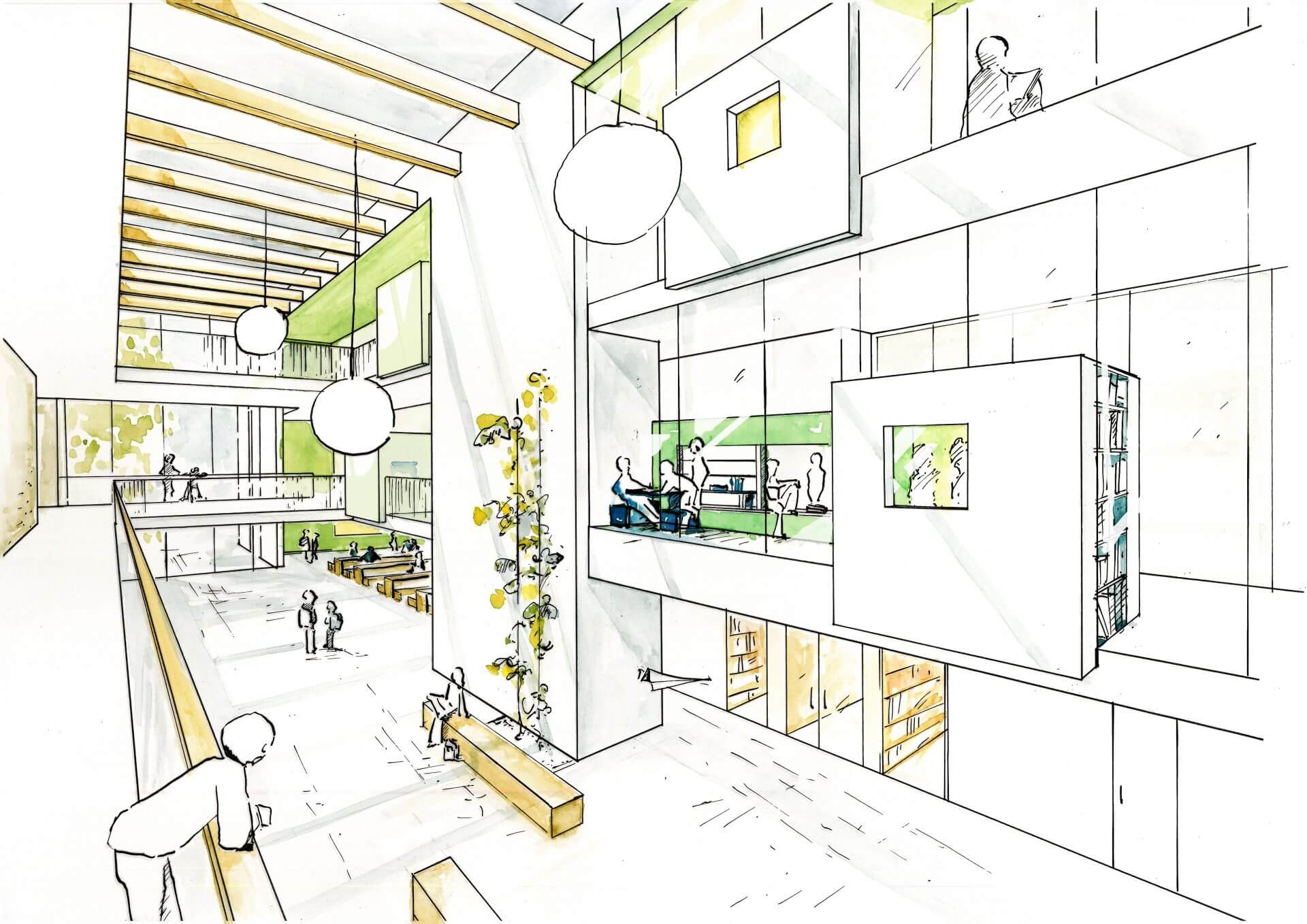 Im Sinne der Inklusionsthematik sind beide Schulen in einem Gebäudekomplex vereint und sind durch Ihre Baukörper dennoch als eigenständige Schulen ables- und nutzbar. Die Aula ist der gemeinsame Erschließungsraum, Herzstück der Kommunikation in Pausen, bei Festen und nicht zuletzt auch das zentrale Element des Energiekonzepts. Die Aula bietet Vertrauten und Neuen eine optimale Orientierung im Gebäudeensemble.